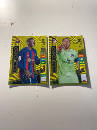 Dos cartas de fútbol Panini de la temporada 22/23. - Carta de Ousmane Dembélé. - Carta de Jan Oblak. - Diseño Balón de Oro. - Incluyen estadísticas y escudo del equipo.