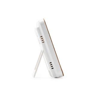 Termómetro digital con acabado en madera. Muestra la hora, temperatura y humedad. Panel de control táctil. Registro de temperatura y humedad máxima y mínima.