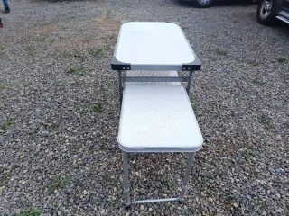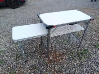 Mesa plegable de cocina, ideal para camping o actividades al aire libre. Su diseño permite un fácil transporte y montaje. - Estructura de aluminio. - Superficie de mesa blanca. - Estante inferior de rejilla metálica. - Estante intermedio con estampado floral.