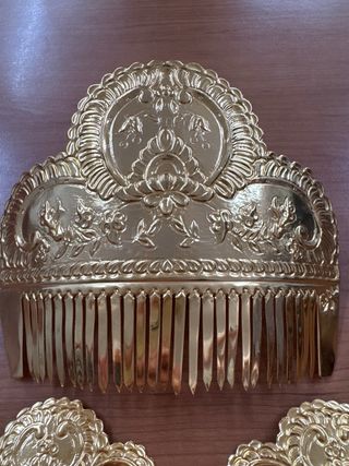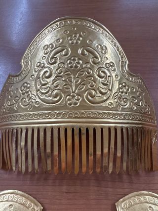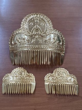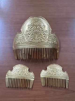 Conjunto de tres peinetas de estilo fallero, con acabado en oro. - Diseño ornamental con detalles. - Acabado dorado brillante.
