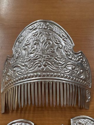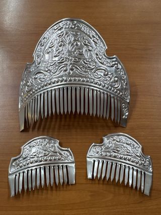 Conjunto de tres peinetas de plata con un diseño intrincado. - Elaboradas en plata. - Tres piezas incluidas en el conjunto. - Decoración floral y detalles ornamentales. Sin su caja original