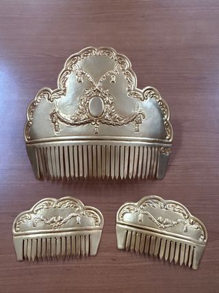 Elegante conjunto de tres peinetas doradas, perfectas para adornar el cabello. - Diseño intrincado y detallado. - Acabado brillante en tono dorado. - Incluye una peineta grande y dos más pequeñas. Sin su caja original