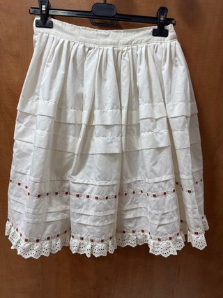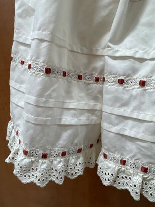 Preciosa enagua blanca para niña, con múltiples capas de volantes y detalles. - Tejido ligero y vaporoso. - Adornos de cinta roja y encaje en el bajo. - Cintura elástica para mayor comodidad. Tiene dos lorzas que se puede hacer más largo. Medidas largo 56 cms x 72 cms de cintura