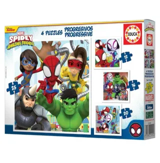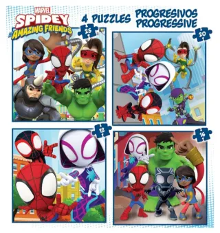 Educa - Progresivos Spidey and His Amazing Friends 12-16-20-25 4 Puzzles progresivos de cartón con 12-16-20-25 Piezas Medida aproximada de Cada Puzzle 16 x 16 cm A Partir de 3 años (19295