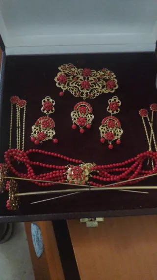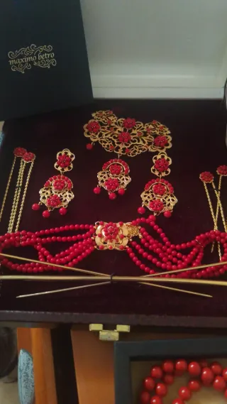 Conjunto de aderezo tradicional con coral y detalles dorados.