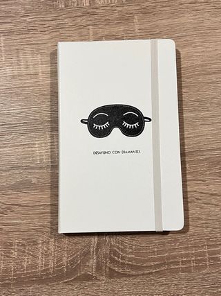 Libreta blanca con diseño de antifaz para dormir. - Diseño Desayuno con Diamantes. - Goma elástica gris para cierre.