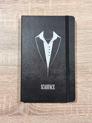 Libreta negro con diseño de traje y el logo de Scarface. - Tapa dura. - Goma elástica para cierre.