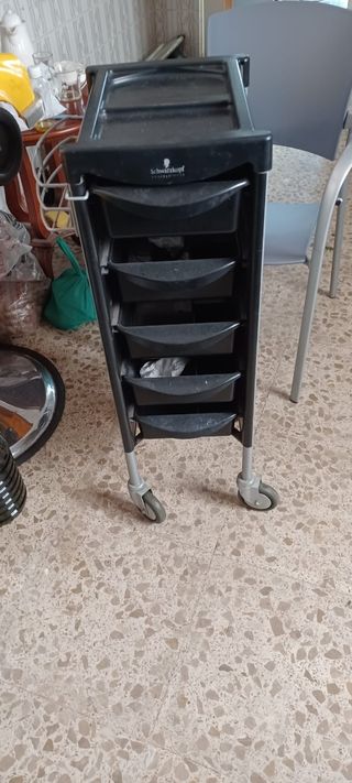 Carrito de peluquería con varios cajones para guardar utensilios. Está en buen estado, aunque presenta algunas señales de uso. - Carro con ruedas para facilitar su movilidad. - Estructura resistente y estable. - Cajones de plástico de color negro y gris.