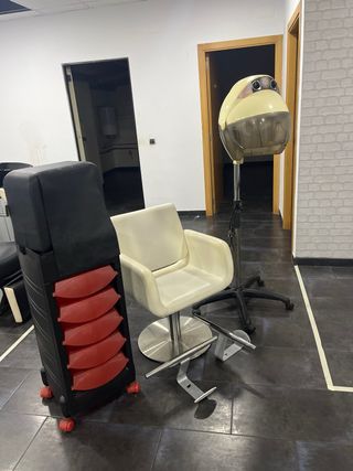 Se vende mobiliario de peluqueria en perfecto estado y listo para arrancar tu negocio. INCLUYE: • 2 Tocadores dobles con sus sillas (4 sillas) • 1 Secador de cabeza + 1 de infrarrojos • Asiento de espera con su respaldo • Mueble de recepción • 2 Lava cabezas • Carrito de ajuda (completo de rulos, peines, cepillos y bigudis para permanentes/placas de alisado) • 2 Estanterías completas de productos (planchas, rizadores, tintes Salerm, tratamientos, oxidantes, decoloración, entre otros...) • Carrito de manicuras