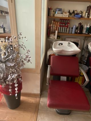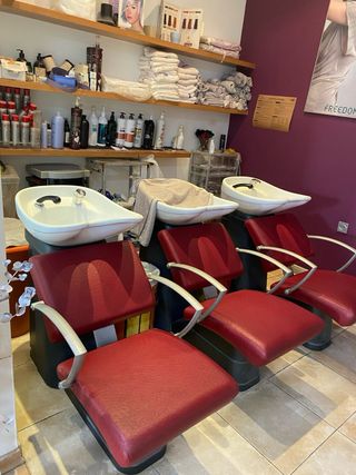 Conjunto de mobiliario para salón de peluquería. - 8 Sillas de peluquería rojas. - laboratorio - 3 Lavacabezas. - 8 Tocadores con espejo y reposapies - Carrito auxiliar. - 2 Sillones rojos en sala de espera y 2 puff blancos con mesa a juego. Regalo recepción. Precio a negociar.