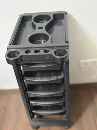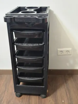 Carrito de peluquería con 5 cajones, ideal para organizar herramientas y productos. Está en buen estado, aunque presenta algunas marcas de uso. - Carro negro con 5 cajones. - Estructura resistente. - Ruedas para facilitar el movimiento.