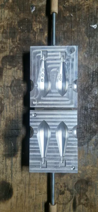 Molde de CNC para la fabricación de plomos de pesca. De 80 y 100gr con rolling del 2 Permite crear plomos con un diseño aerodinámico. - Fabricado en aluminio. - Diseño de dos cavidades.