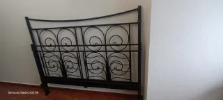 Elegante cabezal de cama de forja en color negro. Su diseño con espirales le da un toque clásico y sofisticado. - Material: Forja. - Color: Negro. - Diseño: Espirales decorativas.