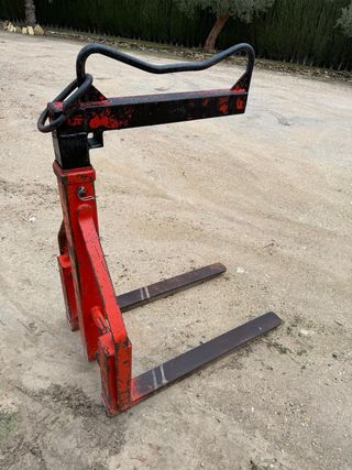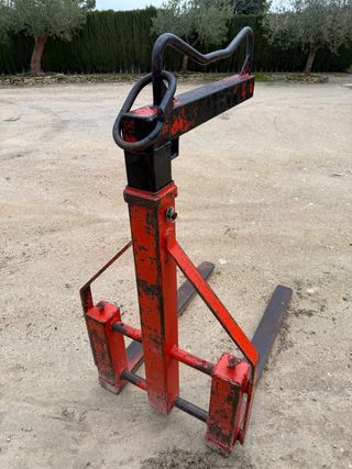 Accesorio para grúa diseñado para el transporte de palets. Su estructura es robusta y está pintada en rojo y negro. - Mecanismo de enganche para grúa. - Horquillas para palets.