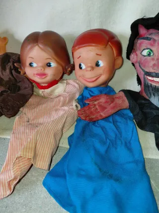Conjunto de muñecos de guiñol con cabezas de plástico y cuerpos de tela. Muñecos de: lobo, dos niños, una princesa, un príncipe, un diablo, un rey, una reina y una bruja.