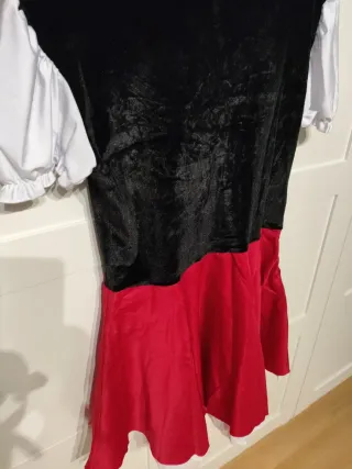Disfraz de pastorcilla con detalles tradicionales. De sisa a sisa 50 cms - Cuerpo negro con escote ribeteado en blanco. - Mangas abullonadas blancas. - Lazos blancos en el escote. - Falda roja con puntilla blanca.