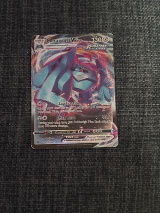 Carta Pokémon Metagross VMAX de la expansión Rapid Strike. - Número de carta: 113/198. - Ataque Zap Traction para buscar cartas en el mazo. - Ataque Max Rush con daño adicional. - Regla VMAX: el oponente toma 3 cartas de Premio si este Pokémon es Derrotado.