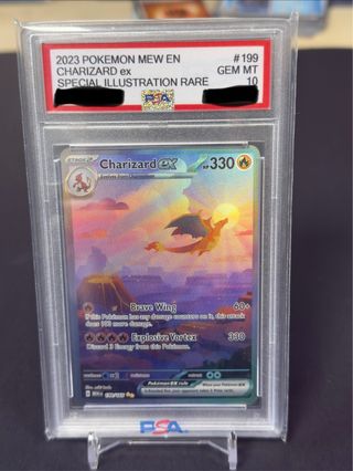 Carta Pokémon Charizard ex, edición especial de ilustración rara. - Número de carta: 199/165 - Grado: GEM MT 10 - Año: 2023 - Tipo: Stage 2 - Ataques: Brave Wing, Explosive Vortex