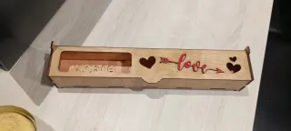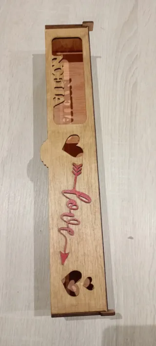 Caja de madera con diseño personalizado. - Grabado con el nombre a elegir. - Decoración con Love y corazones. - Ideal para regalos o detalles.