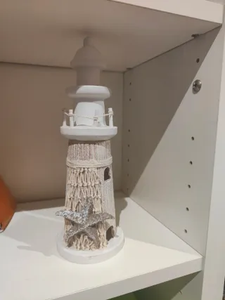 Este faro decorativo añade un toque náutico a tu hogar. Su diseño evoca la brisa marina y las costas. - Base redonda blanca. - Cuerpo de madera con red. - Estrella de mar plateada. - Parte superior blanca con detalles de cuerda.
