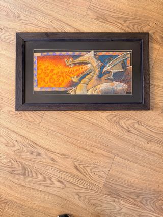 Cuadro ORIGINAL con una ilustración de un dragón lanzando fuego. Técnica collage, papel, pastel y lápices. - Marco de madera oscuro. MEDIDAS: 63 x 37 cm
