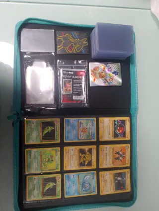 Álbum con colección de cartas Pokémon, incluye fundas protectoras. - Incluye toploaders, muchas fundas para cartas Pokémon y el propio albúm. - Varias cartas Pokémon incluidas (Full arts, Art rares, Secret art rares, Holo cosmos, Cracked ice, Holo reverse, Ex, GX, Trainers, Pokeballs, Masterballs, V, VAstro, Promos Mc Donald's, Promos) -Las fundas penny sleeves de Ultra Pro no incluye las 100 unidades. -Escucho ofertas. -Ofreced un precio, y así negociamos el precio, gracias.