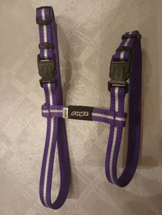 Arnés para perro de raza pequeña, ideal para paseos. Es cómodo y seguro. Es para tipo Chihuahua o yorkshire terrier o Pincher - Color morado con rayas blancas. - Hebillas ajustables.