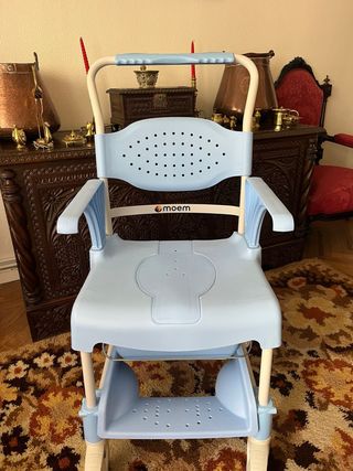 • Modelo: Moem 150 kg • Asiento con abertura y cubeta extraíble • Apoyabrazos desmontables • Asiento regulable en altura • 4 ruedas con freno • Ligera y resistente • Peso silla: 15 kg