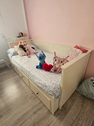 Cama diván de estilo clásico, ideal para aprovechar el espacio. Su diseño neutro se adapta a cualquier habitación. - Estructura de madera lacada en blanco. - Tres cajones integrados para almacenamiento. - Respaldo y laterales con diseño de lamas. -Está en muy buenas condiciones,solo tiene esos roces de la mudanza. -Se vende sin el colchón -Solo venta en persona