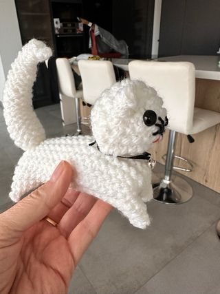 Adorable gatito hecho a mano con hilo blanco. - Diseño de gatito tejido. - Detalles de ojos negros y boca bordada. - Lleva un collar negro con un pequeño cascabel plateado.
