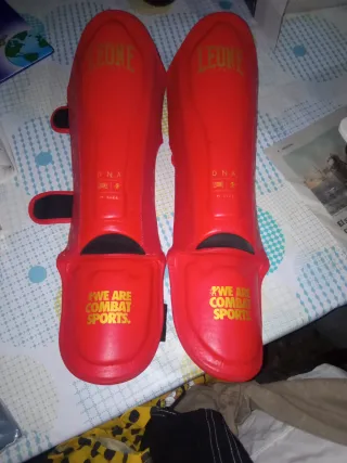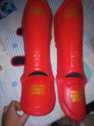 Espinilleras deportivas de la marca Leone. - Color rojo. - Talla M. - Diseño We are combat sports.