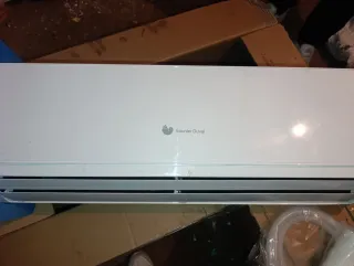 Unidad interior de aire acondicionado de la marca Saunier Duval. Diseño moderno y elegante en color blanco. - Logo de la marca visible en la parte frontal.