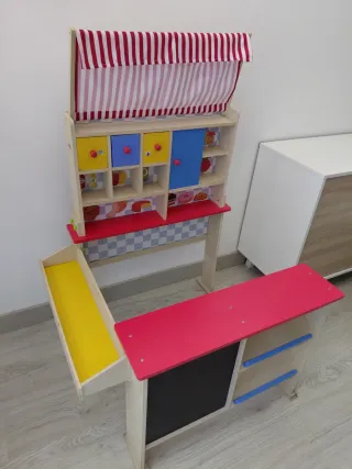 Divertido mercado de madera para jugar. - Estructura de madera. - Techo a rayas rojas y blancas. - Cajones de colores. - Pizarra. - Estantes. No envío.
