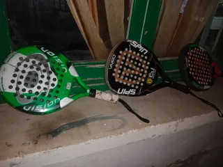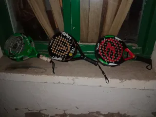 Se venden tres palas de pádel, dos de la marca Vision y una de la marca Vairo. - Pala Vision verde y blanca. - Pala Vairo negra y dorada. - Pala de pádel adicional.