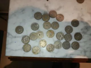 Conjunto de varias monedas antiguas de diferentes países y épocas. Algunas presentan agujero central. - Monedas de metal. - Diseños variados con inscripciones y grabados. - Ideal para coleccionistas.