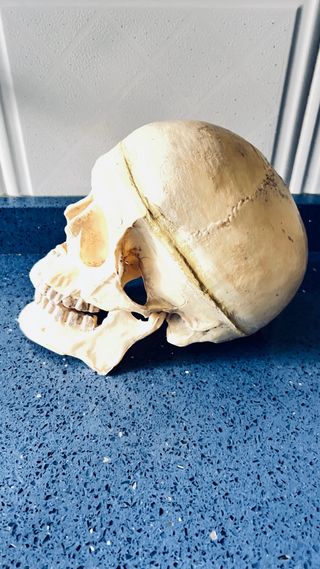Calavera decorativa con un aspecto realista. - Material: Plástico. - Color: Hueso. - Detalle de suturas craneales.