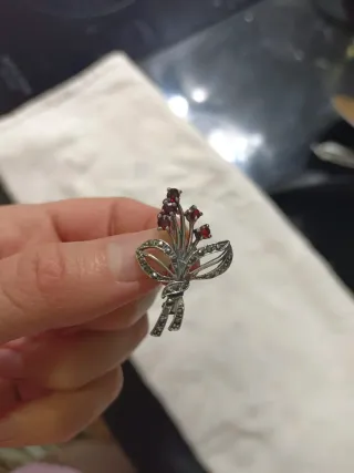 Este broche de plata tiene un diseño de ramo con pequeñas piedras rojas granates - Diseño de ramo con lazo. - Adornado con marcasitas.