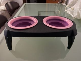 Práctico comedero doble para mascotas con cuencos extraíbles. - Base negra. - Cuencos de silicona plegables en color rosa y morado. - nunca a sido utilizado.