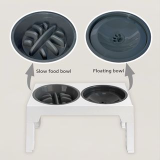 Comedero elevado para perros o gatos con dos cuencos. - Diseño moderno en color blanco. - Cuencos de plástico gris oscuro. - Uno de los cuencos tiene un diseño para ralentizar la ingesta. - Altura ajustable para mayor comodidad.