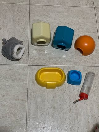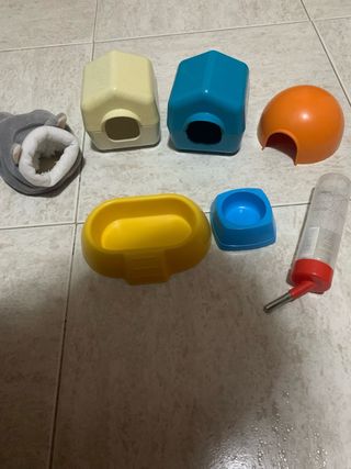 Lote de accesorios para hámster, ideal para crear un espacio cómodo y funcional para tu mascota. - Incluye dos casitas de plástico en forma de casa, una en color amarillo y otra en azul. - Una casita adicional tipo iglú de tela gris con interior suave. - Un comedero grande de plástico amarillo. - Un comedero pequeño de plástico azul. - Un bebedero con depósito transparente y boquilla metálica.