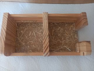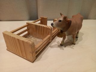 Se vende comedero de madera de juguete para colocar en los toriles o corrales.se vende junto a la vaca q aparece en la fotografía.