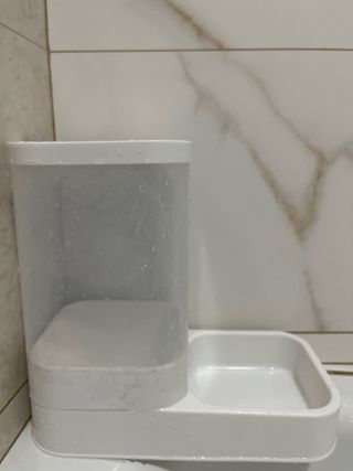 Color azul cuenta con 2 tazos y un dispensador para agua+ un cepillo dental 8€ cuenco. Toallas(100 unid)+bolsas heces(60 unid) 6€