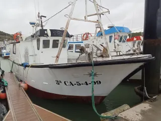 Barco de pesca de tercera lista. - Casco blanco con franja roja. - Identificación 3ª CA-5-4-99 en el casco. - Nombre CALIPSO-2 en la cabina.
