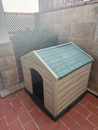Caseta para perros de gran tamaño, ideal para exteriores. Fabricada en plástico resistente y con un diseño de tejado a dos aguas. - Color beige y tejado verde. - Base negra. - Puerta de entrada arqueada.