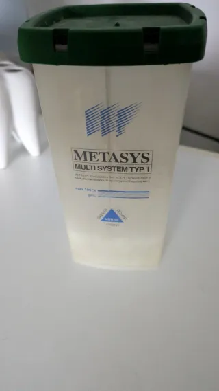Contenedor amarillo Biocompact para objetos punzantes y cortantes y residuos de riesgo biológico. - Homologado para transporte de materiales peligrosos. - Cumple normativa NFX 30-511. - Capacidad: 5 litros.