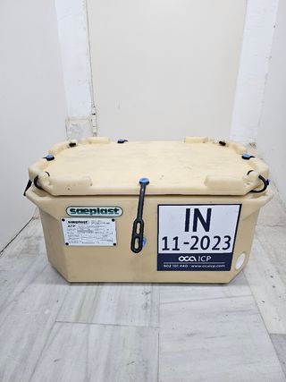 Contenedor isotérmico de plástico color beige claro. Ideal para mantener la temperatura de tus productos. - Fabricado en plástico resistente. - Diseño multifuncional. - Incluye asa para facilitar su transporte. En buen estado. Nuevo.
