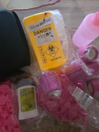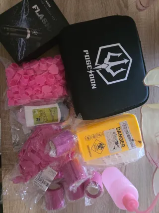 Kit completo para iniciación al tatuaje, incluye varios accesorios. - Máquina de tatuaje inalámbrica FLASH. - Estuche de transporte POSEIDON. - Gorros para tinta de color rosa. - Guantes de nitrilo rosas. - Vendas elásticas de tatuaje rosas. - Bote dispensador para tinta. - Contenedor para residuos biológicos peligrosos.