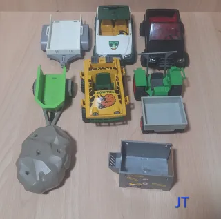 Conjunto de vehículos y accesorios de Playmobil. - Camión todoterreno amarillo con diseño de dinosaurio. - Coche negro con remolque. - Tractor verde con remolque. - Coche blanco y verde con escudo. - Remolque verde. - Remolque blanco. - Contenedor gris con detalles de ciudades. - Roca gris. NO HAGO ENVÍOS X LA EMPRESA GLS. NO RESERVÓ.