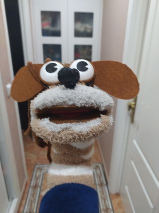 Divertido muñeco de peluche con forma de perro. - Hecho de tela suave. - Ojos grandes y expresivos. - Nariz de pompón negro. - Orejas marrones caídas. - Boca abierta con interior rojo.