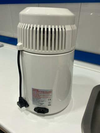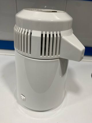 Destilador de agua Mestra en color blanco. - Diseño compacto y moderno. - Botón de reinicio visible en la parte frontal.
